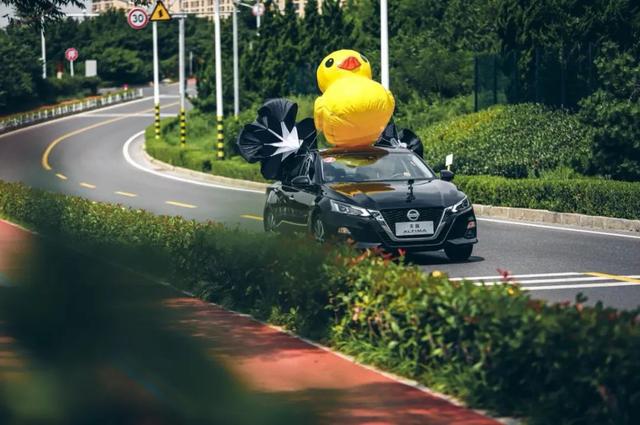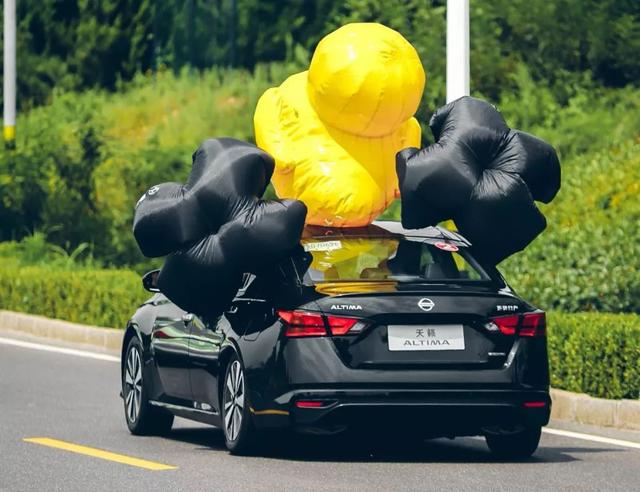 增加的载重已经达到了日常家庭中使用的最高程度,甚至还有超过。不仅如此,全新天籁因为流畅的车身设计还会降低风阻,进而降低油耗,这自然不行。所以另一个任务就是在一个设定路段要将车顶绑上大黄鸭,并加上两个阻力伞,最大限度提高风阻。