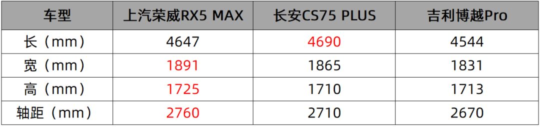 长宽高分别为4647/1891/1725mm,轴距为2760mm,这个车身尺寸奠定了荣威RX5 MAX成为A+级紧凑型SUV的基础。跟一些直接竞争对手对比,荣威RX5 MAX的身材算是比较出众的那一款。