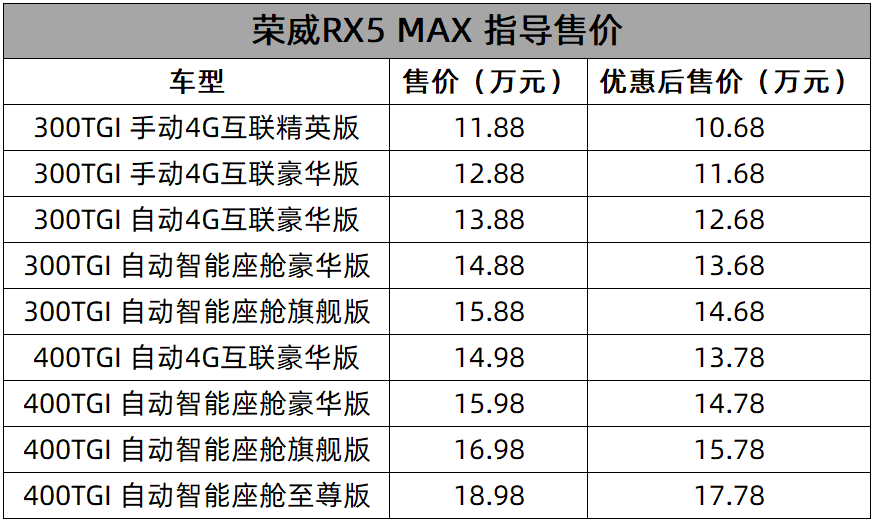 ▶荣威RX5 MAX官方指导价11.88-18.98万元