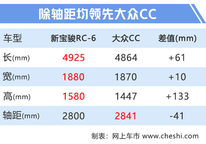 新宝骏RC-6所采用的溜背式造型,并没有太大程度压缩车身高度,相比大众CC还是拥有较为宽敞的头部空间,车长、车宽也优于大众CC,不过轴距表现略有不足。动力部分,新车搭载1.5T涡轮增压发动机,最大功率108kW,综合油耗为7.3L/100km,并满足国六排放标准。传动系统匹配6MT或CVT变速箱。
