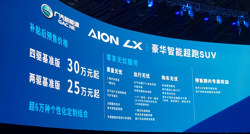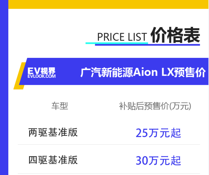 【EV视界报道 新车上市】8月29日,广汽新能源Aion LX (配置|询价)正式开启预售,Aion LX是广汽新能源Aion体系下首款SUV战略车型,Aion LX的NEDC续航里程达到650km,轴距达到了2920mm。新车共预售2款车型,两驱基准型25万元起,四驱基准型30万元起。