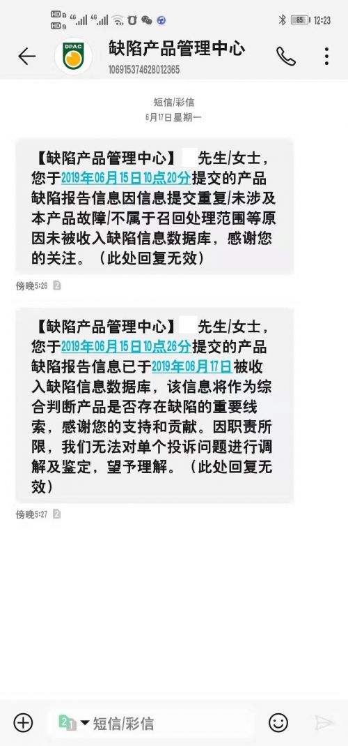 (图为车主提供,想多个平台以及厂家官方投诉得到的反馈)