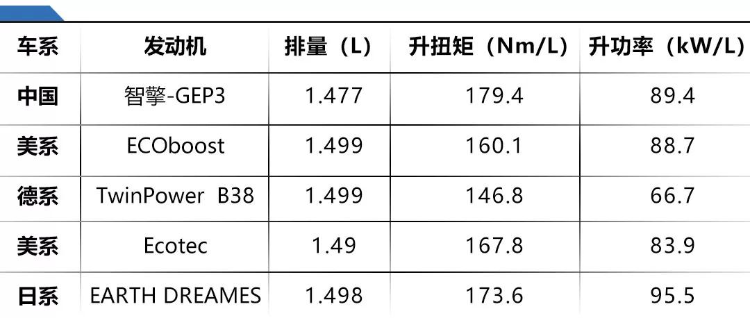买车君以吉利汽车最为走量的智擎1.5TD发动机为例,它是在沃尔沃主导下,吉利与沃尔沃共同研发的全新一代发动机,在升功率、升扭矩、NVH、可靠性、经济性等方面与日韩系、欧美系黄金排量发动机的差距如下表所示。