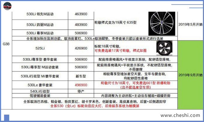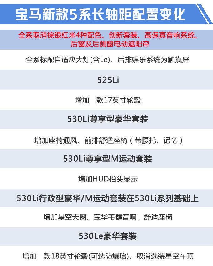 新款5系主要针对车型和配置进行了调整,新车增加一款新车型,同时取消了3.0T车型(现款540Li行政版),用两款530Li行政型作为新的顶配车型,预计售价将会有一定下调。新车将于9月中下旬正式上市,目前可以接受预定,定金为3万元(不可退)。具体配置变化,530Li尊享型豪华套装增加座椅通风、前排舒适座椅;新增的530行政型在尊享型基础上增加了星空天窗、宝华韦健音响、舒适座椅等。