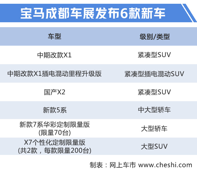 近日网上车市从宝马官方获悉,在9月5日即将开幕的成都车展上,宝马将发布包括中期改款X1 (配置|询价)、中期改款X1插电混动里程升级版、国产X2 (配置|询价)、新款5系、新款7系华彩定制限量版以及X7个性化定制限量版在内的6款新车。其中宝马国产X2在取消进口关税后,售价将出现一定幅度的下调,预计起售价将从28.18万元降至26-27万元之间。