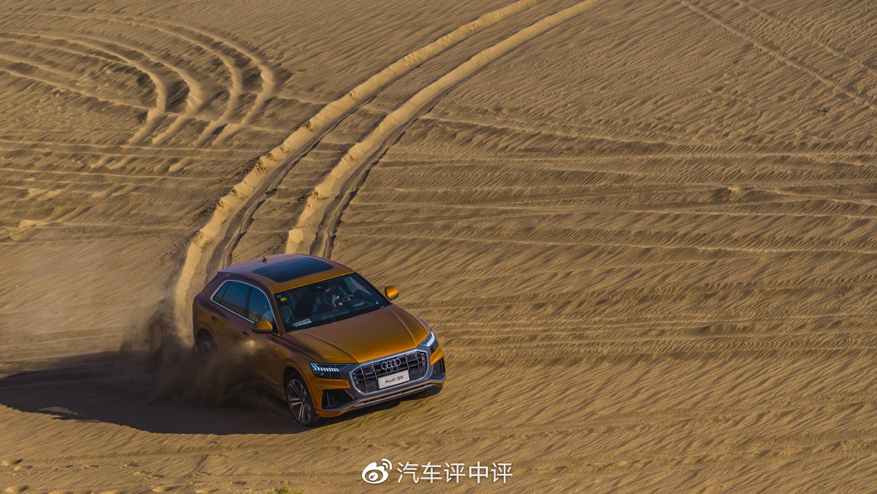 在体验完设计感、舒适性、科技感和公路行驶性能后,沙漠试驾将展示出Q8的最后一项法宝,越野性能。Q8搭载了奥迪看家的Quattro纯机械式中央差速器,配合越野模式和调节范围较大的空气悬挂,在适当调整胎压的情况下,装备原厂轮胎的Q8可以在沙漠里尽情的驰骋。当然这种环境下更加考验的也是驾驶者的技术水平,不过在驾驶者偶尔失误的情况下,这套强大的四驱系统可以为驾驶者凭添几分自信。Quattro默认的前40后60的动力分配,在极限状态下可以调整为前70后30或前15后85。在松软的沙地中可以明显感受到车尾在动力输出时的摆动,乐趣十足。在感觉到车轮阻力过大有可能陷车时,及时用拨片切入一挡,此时强大的扭矩总能化险为夷,让驾驶者信心十足。