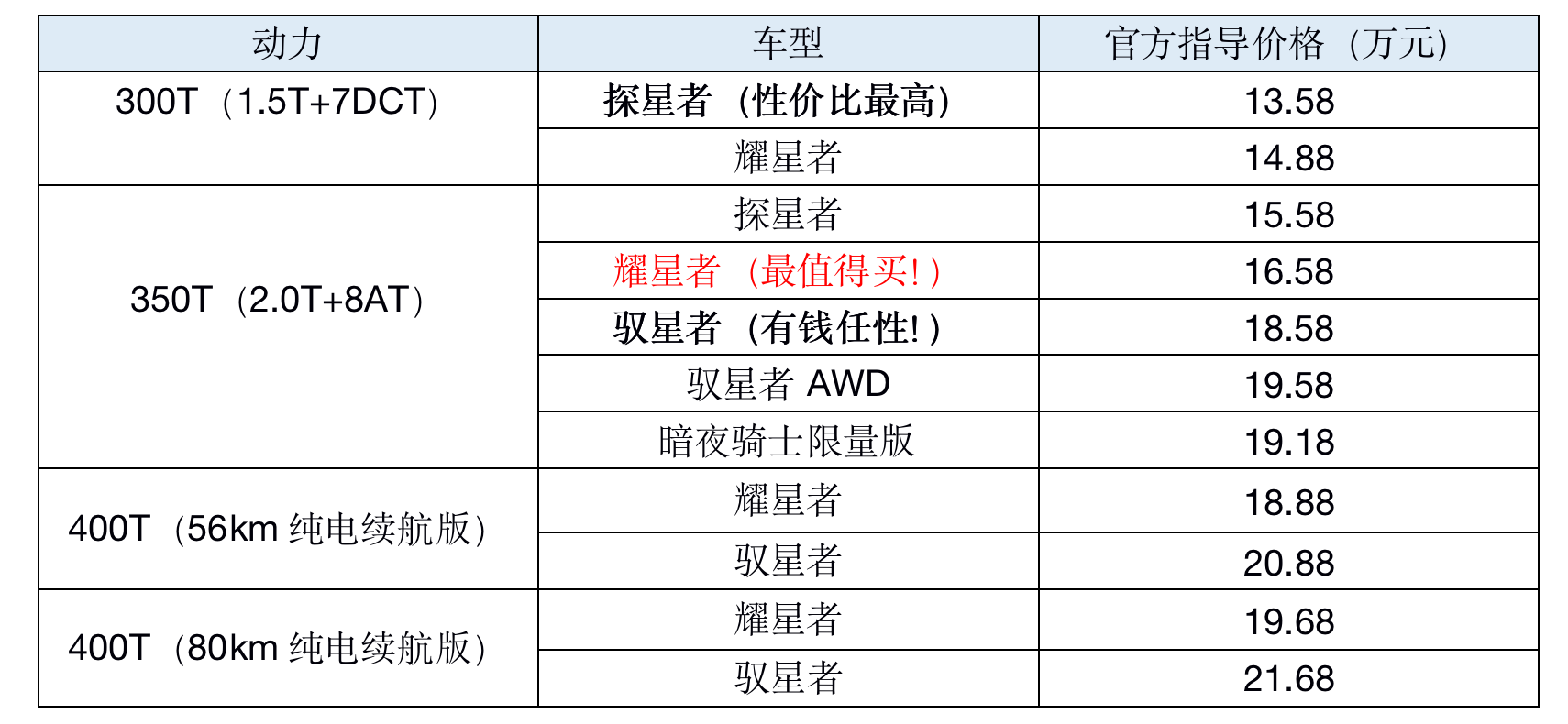 星越共推出1.5T(300T车型)、2.0T(350T车型)以及1.5T插电混动(400T车型)三种动力共计11款车型,指导价格区间为13.58-21.68万元。其中传统燃油动力车型售价区间为13.58-19.18万元,PHEV车型补贴后售价为18.88-21.68万元,本篇文章仅对燃油版车型进行分析。