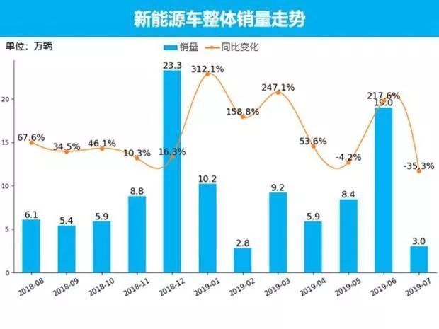 不过,随着新能源汽车补贴的大幅退坡,中国新能源汽车市场也暂别了高增长。从整体新能源市场销量情况来看,2019年7月,新能源车共销售了3.0万辆,占整个市场销量的2.1%。与上个月相比,销量环比下降84%。与去年同期相比,销量同比下跌35.3%,为近一年内历史最低。纯电动汽车在后补贴时代将呈现两极分化的局面。