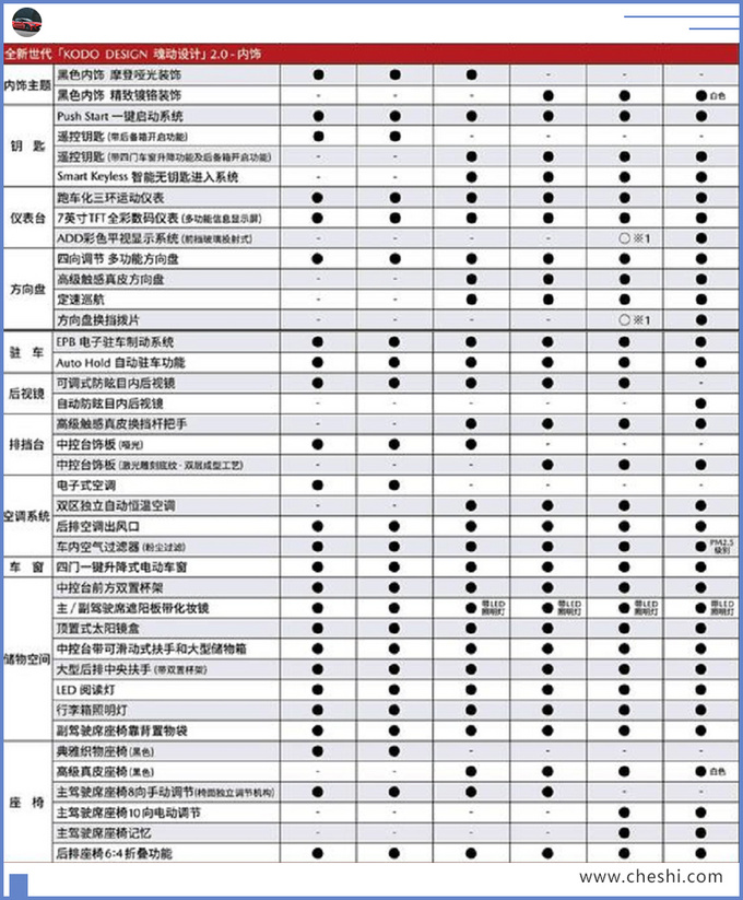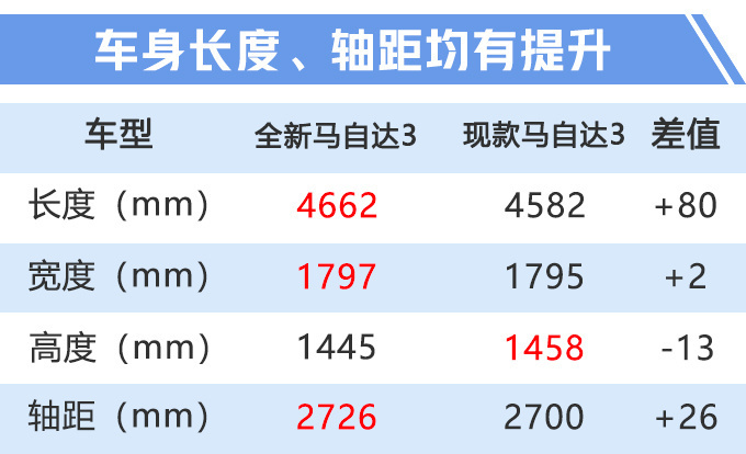 外部配置上,全新马自达3全系标配LED前大灯(高度自动调节、自动延时熄灭、迎宾照明)、LED尾灯组+高位刹车灯、16英寸轮毂等。2.0L车型额外增加外后视镜电动折叠+电加热+记忆功能,并且升级为20英寸轮毂。内部配置上,新车标配一键启动、遥控钥匙、7英寸仪表、自动驻车等。高配版增加HUD、定速巡航、方向盘换挡拨片、双区独立空调、主驾驶席座椅记忆+10向电动调节等。