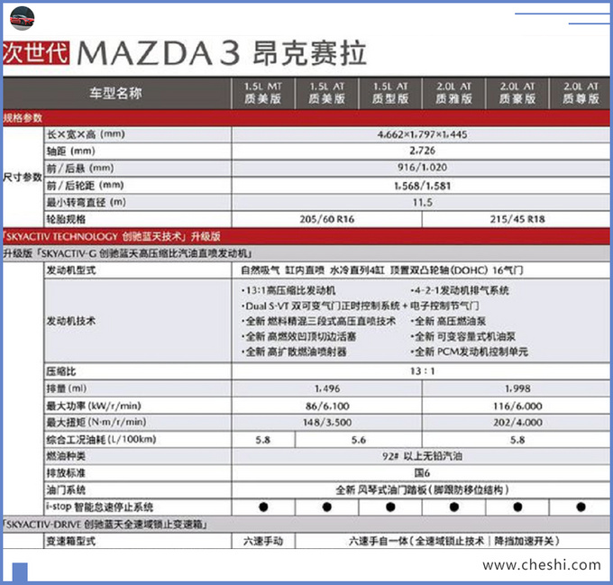 整体配置方面全新马自达3较现款大幅提升,多项安全、科技配置都是全系标配,而2.0L版本更注重用车体验以及驾乘安全。该车采用新一代的Skyactiv Vehicle Architecture车体架构,车身长度及轴距均有所提升。动力方面,新车先期搭载Skyactiv-G系列1.5L和2.0L发动机,最大功率86kW和116kW,采用HCCI技术的Skyactiv-X 2.0L发动机,预计在明年年中才会上市。