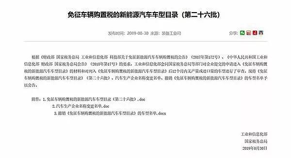 另外,同样对对列入《免征车辆购置税的新能源汽车车型目录》后12个月内无产量或进口量的车型进行了审查。现将《免征车辆购置税的新能源汽车车型目录》(第二十六批)、汽车生产企业名称变更名单、撤销《免征车辆购置税的新能源汽车车型目录》的车型名单予以公告。