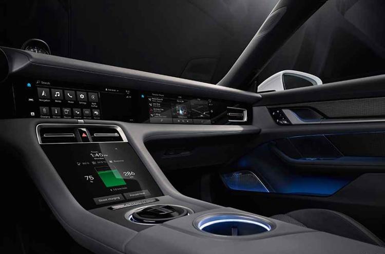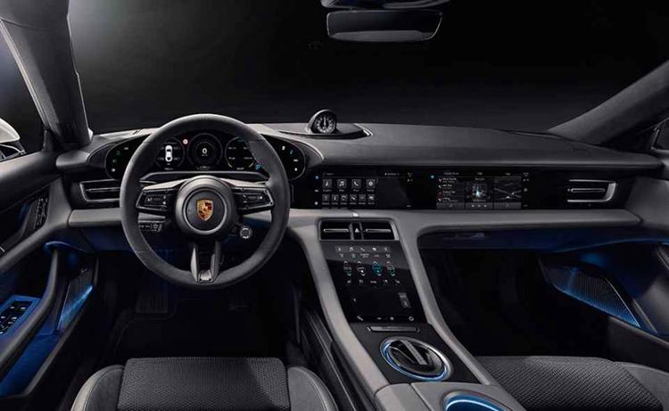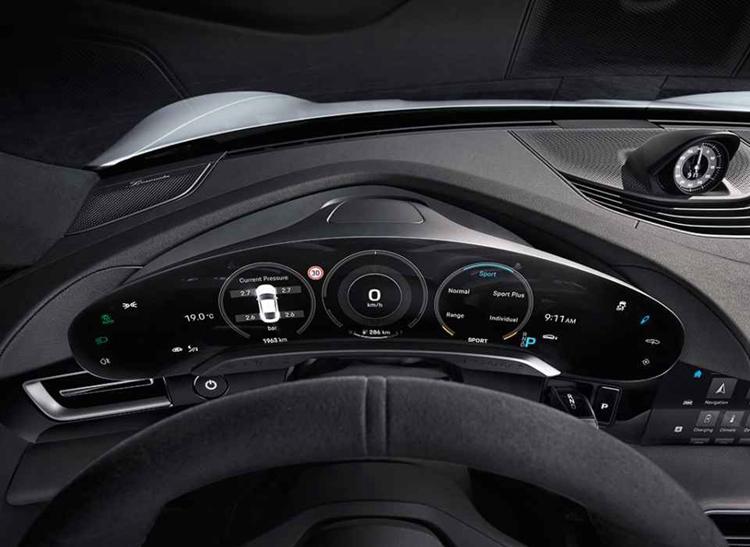 Taycan 仪表盘采用一块 16.8 英寸曲面屏,并提供4种显示模式,包括经典模式、地图模式、全地图模式和纯净模式。仪表台两侧还具备触控操作区,左侧为灯光控制,右侧为部分车辆设置按钮,而这些控制区布局设计灵感同样源于第一代保时捷 911。