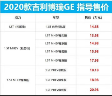吉利汽车算是自主品牌中轿车领域的领跑者,在各大车企纷纷转型SUV市场时,吉利汽车仍坚守轿车车型市场,这份坚持让吉利汽车得以声名远扬。据官方宣布2020款博瑞GE轿车正式上市,其大致售价如下图,1.5T轻混动只有13多万,另外,这款汽车一大特点是双开门设计,现在我们来看一看。