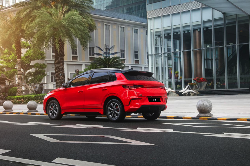 e2 作为比亚迪e系列首款跨界车型,相比较于e系列的另外两款车型在造型设计上更显简洁、运动,整体呈现出的视觉效果更加出众。整车尺寸别为4240/1760/1530mm,轴距为2610mm。