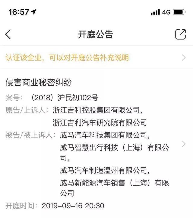 最近,一宗有关汽车行业侵害商业秘密的纠纷,引起各界的关注:浙江吉利控股集团, 吉利汽车研究院(以下简称吉利汽车),起诉威马汽车及旗下四家公司,原因是后者侵害了吉利汽车的商业秘密。目前上海高院已经介入审理,开庭时间为2019年9月16日。