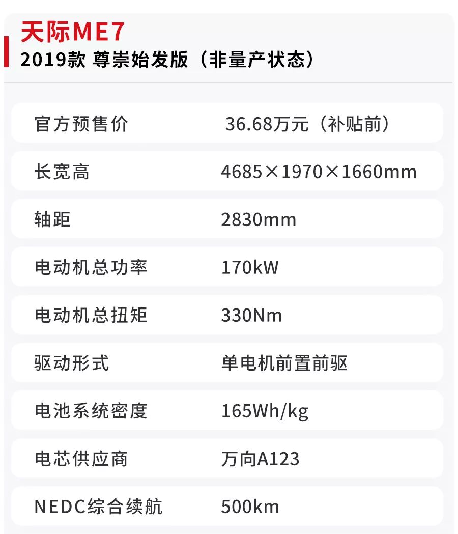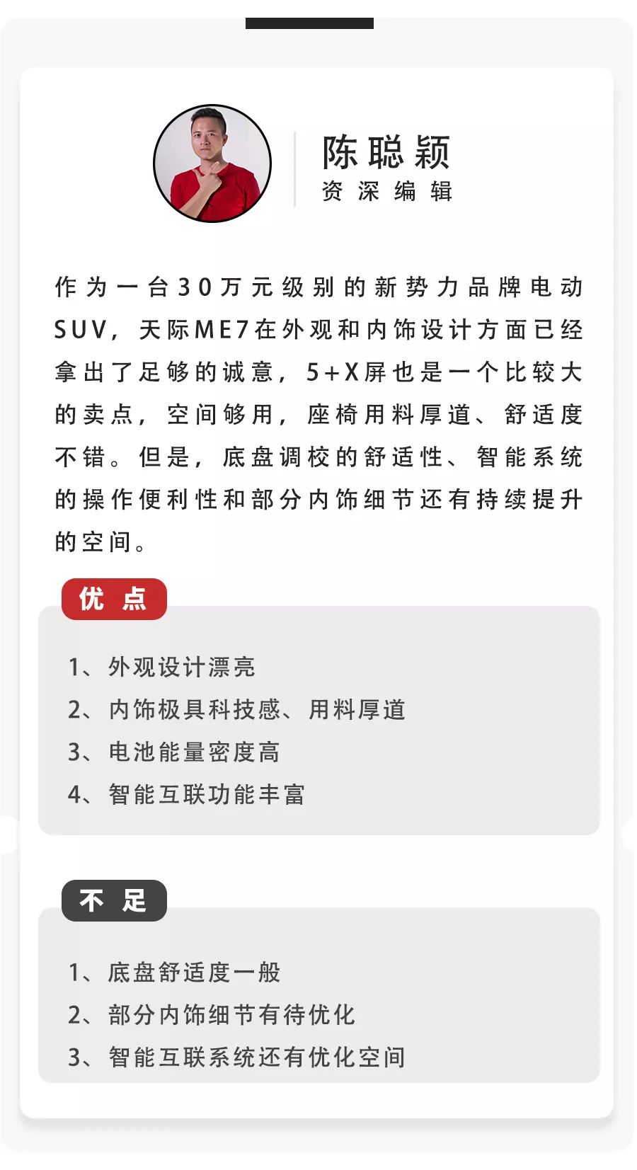 对于电动车的加速性能,一般分为两个派别:一个是认为要追求尽可能快的加速性能;另一个则觉得电动车的加速不需要太快,差不多就行了。天际ME7是属于后者,其认为单电机带来的推背感对于很多用户车主来说已经足够了,这是不同的造车厂商对于车辆性能的取向。