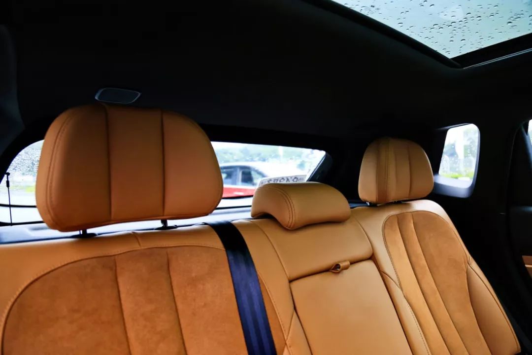 座椅采用Nappa真皮材质,前排座椅宽大舒适,腰部支撑到位,坐垫的摩擦系数较高,坐上去就能感觉到很高级。更值得称赞的是它的后排座椅,坐垫足够长、软硬度适中,对于大腿的支撑到位。另外,后排座椅的两个头枕非常舒服,对乘客头部的包裹性很好,长途乘坐可以很大程度地减轻疲劳感。