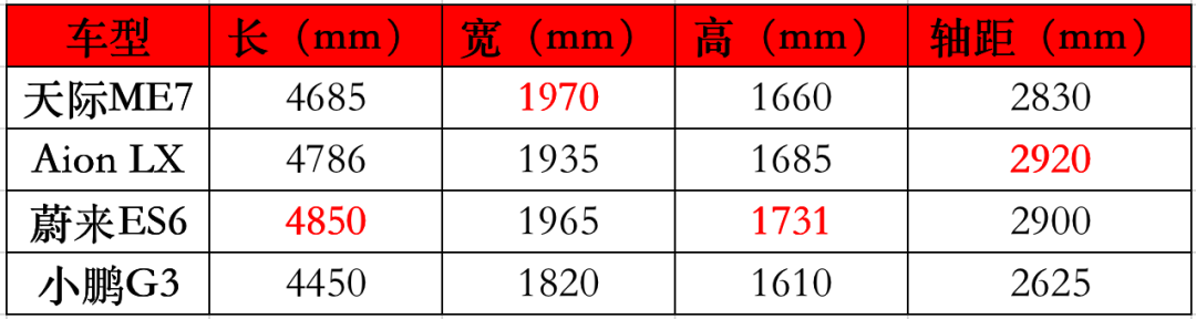 与广汽新能源Aion LX和蔚来ES6一样,天际ME7同样定位中型SUV,但是车身尺寸和轴距都比这两者小,比定位紧凑型SUV的小鹏G3则要大一圈。实际乘坐感受与数据显示基本一致,天际ME7的前排空间足够宽大,特别是横向空间表现不错;其后排腿部空间虽然不算局促,但比蔚来ES6和Aion LX稍微窄一点。另外,虽然天际ME7轿跑SUV的造型令它的车身高度偏低,但其后排的头部空间还算比较充裕。