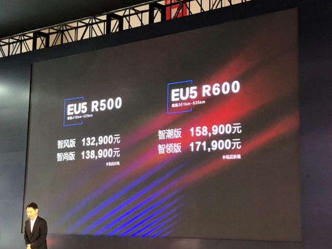 A级纯电动轿车北汽新能源EU5 (配置|询价),在今年1-7月,以56,212辆的累计销量,斩获纯电动、新能源市场双料第一。9月5日,北汽新能源在第22届成都车展上正式推出了2款EU5 R600车型,补贴后官方售价分别为15.89万元和17.19万元。新车配备液冷电池,NEDC工况续驶里程可达501km,相比EU5 R550提升了41km。