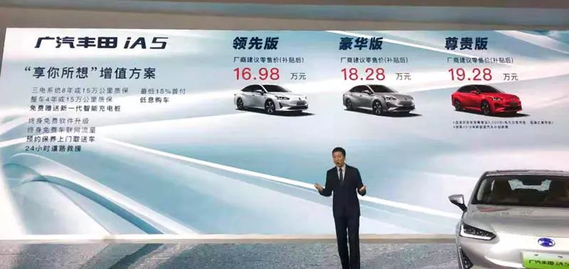 广汽丰田首款纯电动轿车iA5在成都车展正式上市,补贴后售价 16.98 万~ 19.28 万元。新车定位为长续航大空间新体验EV,是目前合资车企首款综合续航达到 510 km 的车型。新车预计今年 10 月份到店销售。