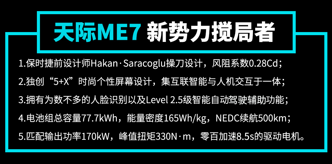 纯电动车,跑得远不远往往是影响用户选择的关键!因此,ME7匹配了容量为77.7kWh、能量密度高达165wh/kg的三元锂电池组,NEDC测试标准下,车辆的综合续航里程可以达到500km。