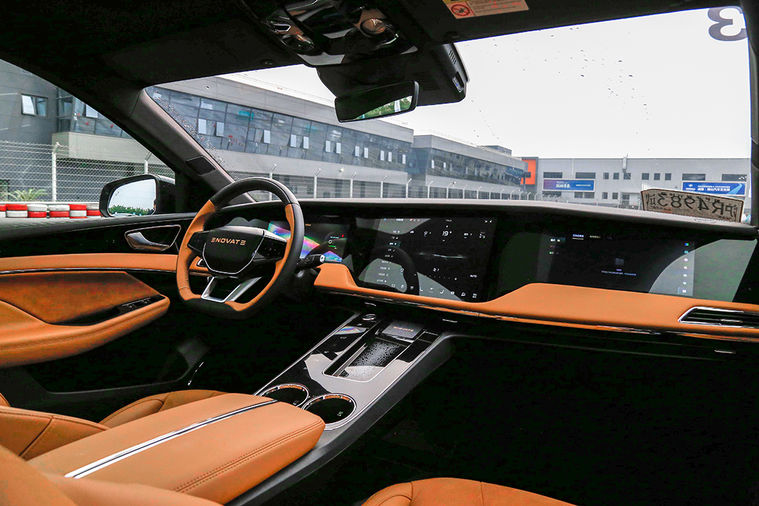 敞开车门,ME7环抱座舱设计与三块大屏幕异常吸睛,科技感满满,撞色系主题也没有半点设计冗余,反而能够给人以高端大气的感觉。