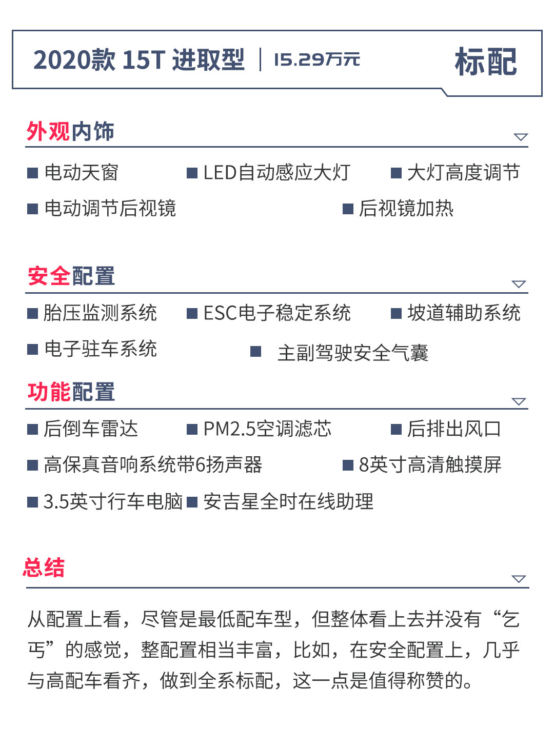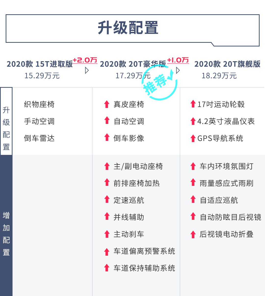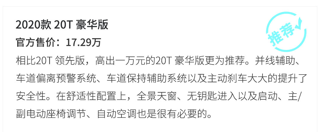 在15T 进取版和20T 豪华版之间还存在着一款20T 领先版,但该车型与前者相比配置变化不大,仅为动力上的区别。