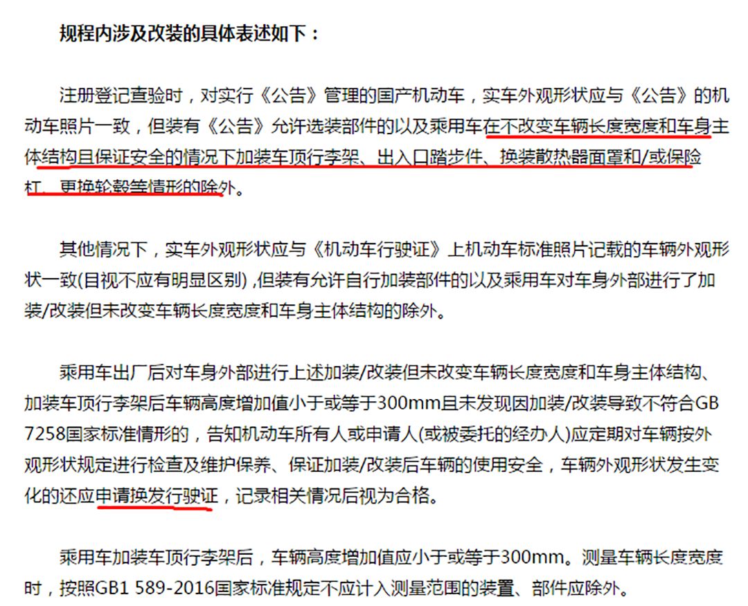 9月1日起,公安部发布的新版《机动车查验规程》(GA801-2019)正式实施,在新版规程中放宽了对于车辆改装的要求。本次新规程明确了:在保证不改变机动车主体结构及安全的前提下,可以加装、改装行李架,但要保证不超过300mm高度。同样,在不改变车身宽度的情况下,可以加装踏板、保险杠、以及更换散热面罩和轮圈式样,但轮胎规格不得改变。车主在完成改装后,需要尽快到当地车管所进行新行驶证的更换及申领。主要内容可看上图。