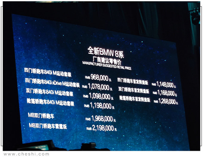 9月4日,宝马全新8系家族正式上市,共推出9款车型,官方售价区间为96.8-230万元。其中8系四门轿跑车售价分别为96.8万元、107.8万元;8系双门轿跑车/敞篷轿跑车售价分别为109.8万元、119.8万元;M8双门轿跑车售价分别为196.8万元、219.8万元;3款首发限量版车型共88台,售价区间为114.8-126.8万元。作为宝马的旗舰产品,时隔20年后8系轿跑车家族迎来回归,全系搭载3.0T L6和4.4T V8发动机,百公里加速最快可以在3.2秒内完成。