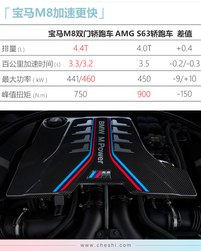 宝马M8双门跑车搭载由宝马M部门调校过的4.4T V8发动机,传动系统匹配M 8AT变速箱,普通版车型最大功率达到441kW,峰值扭矩为750N.m,百公里加速仅需3.3秒;雷霆版车型最大功率达到460kW,峰值扭矩为750N.m,百公里加速在3.2秒内完成。