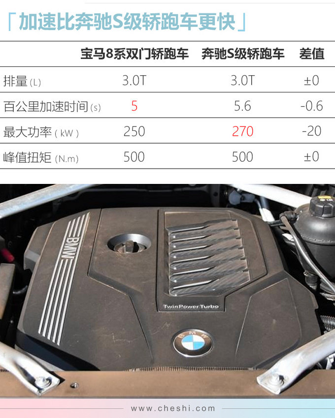 宝马8系双门轿跑车/敞篷轿跑车搭载3.0T直列六缸发动机,最大功率为250kW,峰值扭矩为500N.m,传动系统匹配8AT变速箱。其中8系双门轿跑车百公里加速时间为5秒,每百公里综合油耗为7.6L;8系敞篷轿跑车百公里加速时间为5.3秒,每百公里综合油耗为8L。