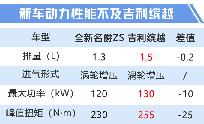 动力部分,全新名爵ZS搭载一台1.3T涡轮增压发动机,最大功率为120kW,峰值扭矩230N·m,传动系统匹配爱信6AT变速箱。新车0-100km/h加速时间为8.5秒,竞争对手主要包括吉利缤越 (配置|询价)、本田缤智 (配置|询价)以及XR-V (配置|询价)等车型。