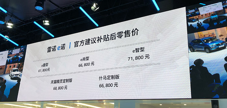 成都车展前夕,在上海车展就已经亮相的雷诺 e 诺正式上市,新车共发布 e 趣型/ e 尚型/ e 智型 3 个版型,售价分别为 6.18 / 6.68 / 7.18 万元。同时还有天猫精灵定制版,售价 6.88 万元;什马定制版,售价 6.68 万元。新车定位为小型 SUV,综合续航里程 271 km。