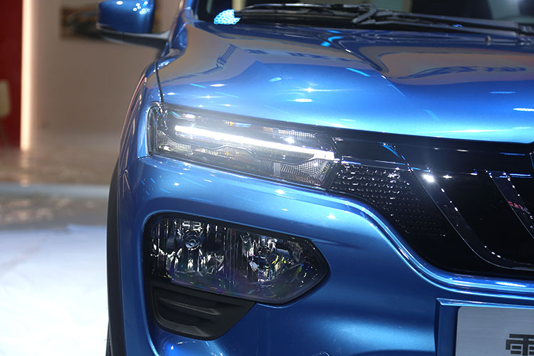 分体大灯的上部是远近光灯和日间行车灯,下部是卤素雾灯。日行的的镀铬和格栅装饰巧妙地连在了一起,整体看起来很和谐。而 LOGO 下方是快充口和慢充口。