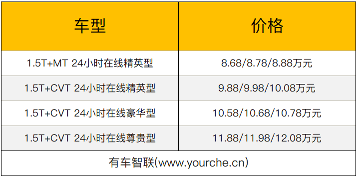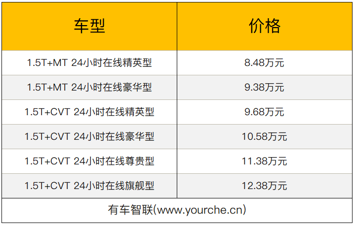 动力方面,新车预计将搭载一台1.5T发动机,最大功率为147马力,与之匹配的是6速手动以及模拟8速CVT变速箱两种变速箱,均符合国六排放标准。