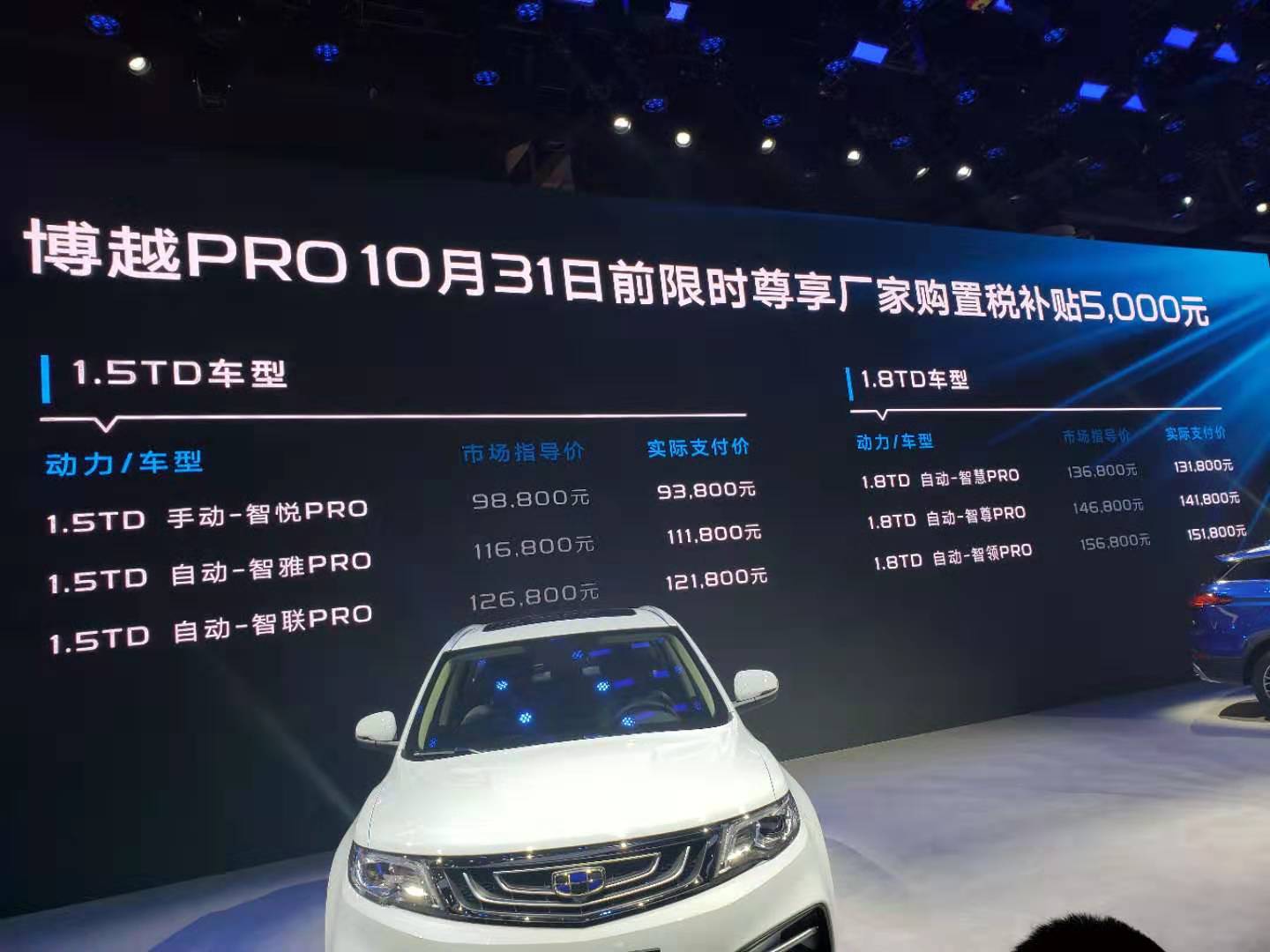买车网2019成都车展前方报道小分队传来消息,吉利汽车旗下博越PRO正式上市,厂商指导售价为9.88万-15.68万元。新车共推出6款车型,外观延续了老款车型的整体设计,细节方面有些改变,动力方面则搭载1.5T、1.8T两款直喷发动机。与此同时,现在购车的用户还可享受到三年免息至高补贴7000元、置换补贴5000元等诸多购车好礼。