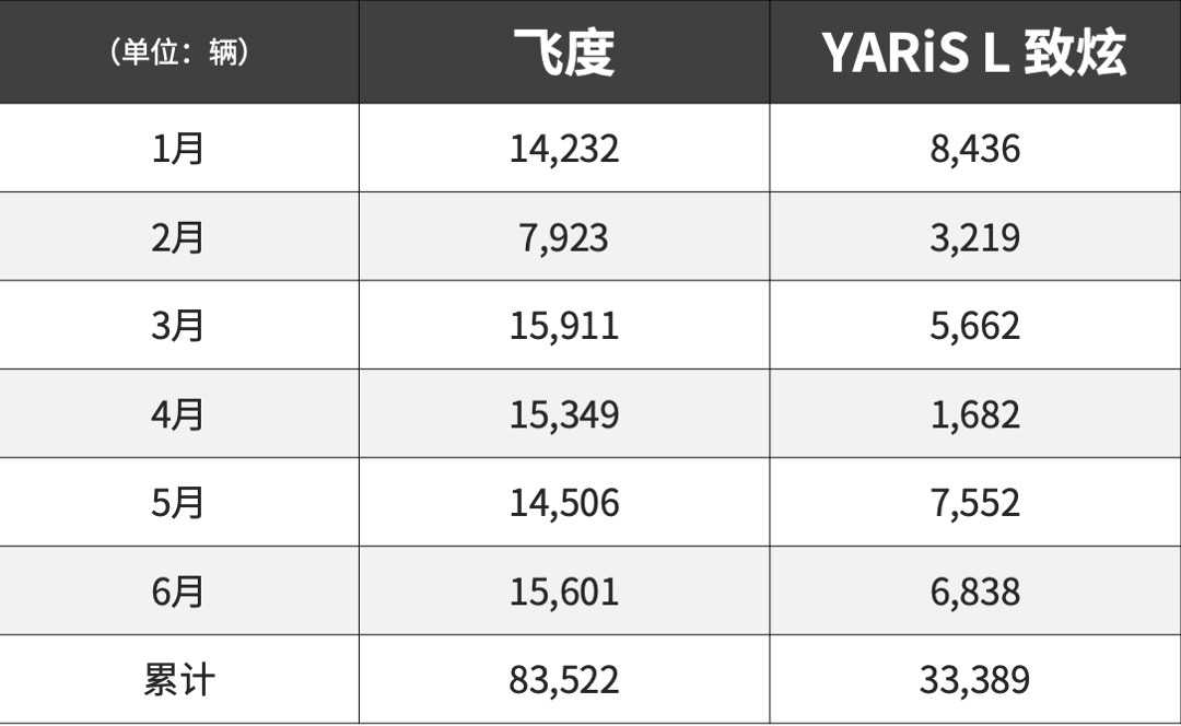 这分别是飞度和老对手丰田YARiS L 致炫在今年1-6月的销量成绩。在如今的“寒潮”之下,飞度的成绩是令人惊喜的,平均每月1万多部的水平不仅在小型车销量榜里排名第一,更是让众多紧凑型车甚至中型车都自愧不如。