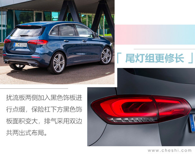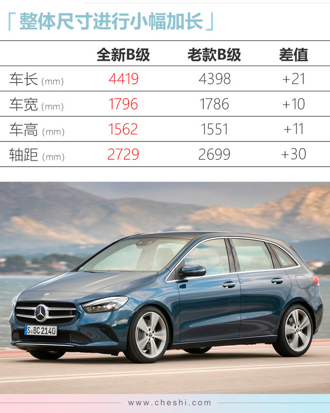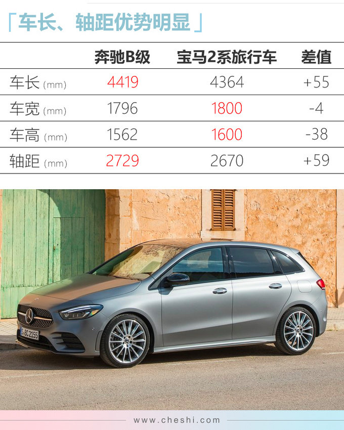 奔驰全新B级进行了小幅加长,其中车长和轴距相比宝马2系旅行车优势明显。新车的内饰与A级如出一辙,与老款车型相比时尚感、豪华感得到明显的提升。全新B级对内部空间进行优化,后排座椅可以4:2:4比例放倒,最大可提供1540L空间,进一步提升实用性。