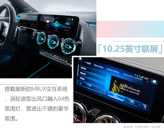 3.内饰采用10.25英寸联屏设计,配备最新的MBUX人机交互系统。