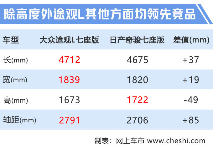 车身尺寸方面,大众途观L七座版也与现款车型保持一致,整体表现优于同级竞品日产奇骏 (配置|询价)。途观L七座版搭载2.0T高功率发动机,传动系统匹配7速双离合变速箱,配备4MOTION四驱系统,动力参数同样领先奇骏。