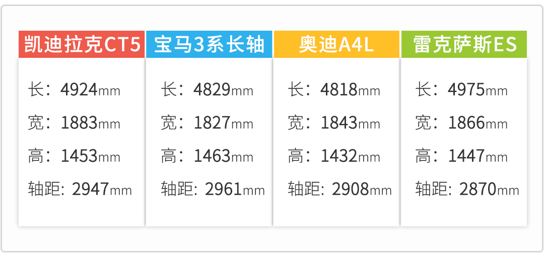 从CT6开始,到最近的XT6,都在使用“田忌赛马”的错位竞争策略,CT5亦是。首先其车身尺寸明显比竞争对手更大一号,用5系的身板去打3系(车身比三系更长更宽),赢的几率更大;其次后驱/四驱的设定更符合豪华车的定位,对阵奥迪A4和雷克萨斯ES更有底气。再者,在配置上CT5也会更慷慨,参考海外版的配置,CT5全系标配LED头灯和尾灯、10英寸中控大屏、电子挡把,前排座椅通风、加热、按摩功能,主动安全系统也一应俱全。