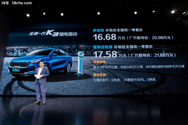 备受关注的全新一代K3插电混动也在成都车展正式上市,共发布两款车型,舒适版补贴后全国统一售价为16.68万元;智享互联版补贴后全国统一售价为17.58万元。购车即享整车3年10万公里,可选择5年6万公里,动力核心部件为8年15万公里,质量保障。12期0首付,0利息、24期首付40%,0利息。