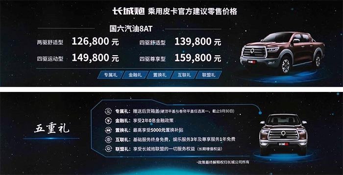 此外,量产版长城炮商用皮卡也同期亮相,将提供汽/柴油发动机、8AT/6MT变速器、长/短货箱以及两驱/四驱等多种版本可选。与此同时,长城炮还发布了“超级五星”计划,从超级符号、超级工厂、超级产品、超级服务、超级体验五大方面发力,打造全场景皮卡车生活, 全面开启了中国皮卡乘用化时代、全球化时代。