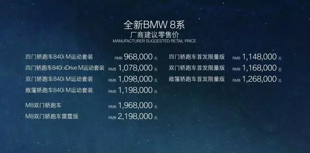 2019年9月4日,全新BMW 8系 (配置|询价)家族携全新BMW 8系四门轿跑车、双门轿跑车、敞篷轿跑车以及全新BMW M8共9款车型,在成都正式上市,售价区间为96.8-219.8万元。