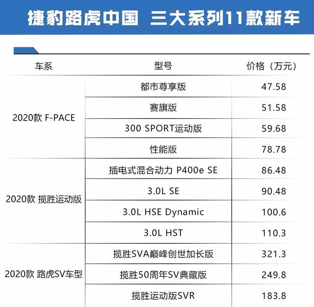 9月4日,2019蓉城(成都)车展开幕前夕,捷豹路虎抢先公布了三大系列在内11款新车的上市售价,当中包括了2020款的捷豹F-PACE (配置|询价)和“揽胜 (配置|询价)50周年”的相关车型以及路虎部分SV定制化车型。
