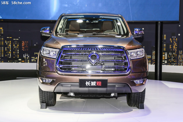 1、这款车的前脸采用梯形大口式进气格栅,三横幅式镀铬装饰条使前脸更具张力,搭配宽大粗壮的前保险杠,使整车车头力量感十足,乍一看颇有美式肌肉皮卡车的感觉。长城炮乘用皮卡标配全LED前后大灯、前后雾灯和流水转向日行灯。