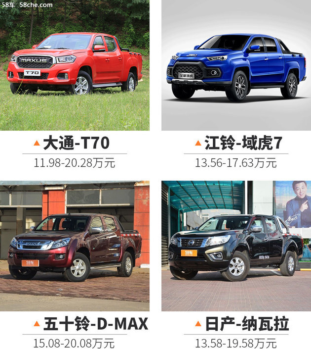 4、长城炮乘用皮卡的竞争对手众多,不仅有来自自主品牌的上汽大通T70和江铃域虎7,还有来自合资品牌当中的日产纳瓦拉 (配置|询价)和五十铃D-MAX (配置|询价)。