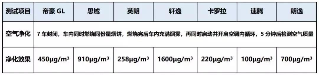 速腾在5分钟后测得的净化效果最为明显,有害物浓度仅为100μg/m³,卡罗拉与英朗紧随其后,而帝豪GL以450μg/m³的成绩排在第四,表现中规中矩。虽然在这项对决中没有拿到第一,但是相对来说已经算是相当优秀的成绩。