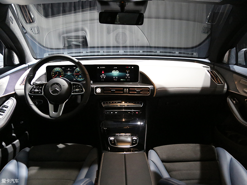 内饰方面,奔驰EQC创世代1886限量版采用了新家族式内饰设计语言,中控屏与仪表盘由两块10.25英寸超大液晶屏幕连接为一个平面,蓝色一键启动按钮及专属空调出风口样式新颖,配合蓝色氛围灯营造出了极佳的精致感。