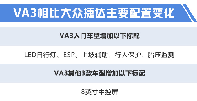 捷达VA3入门版车型增加了LED日行灯、ESP、上坡辅助、行人保护以及胎压监测5项标配,其他3款车型增加了老款车型全系没有配备的8英寸中控屏。可以看出捷达VA3全系车型的基础主被动安全配置更加全面,同时车内娱乐互联配置也得到了提升。